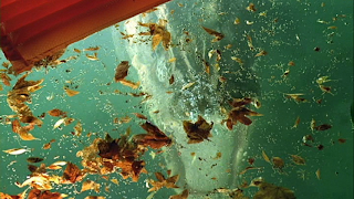 The mother turns on the pool lights, which wakes up the sleeping monster!